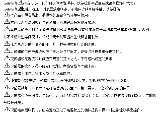 滅菌器在加熱使用時,不準移動。如確實需要移動時,應停止工作后進行,在已經裝有滅菌物時,也不得靠手提手柄移動。