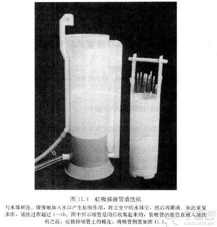 6. 用自來(lái)水通過(guò)清洗器的虹吸作用清洗移液管,**少 4 h,也可用帶有移液接頭的自動(dòng)清洗機(jī)來(lái)清洗,但不要加清潔劑。