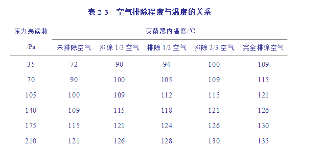 在使用高壓蒸汽滅菌器進行滅菌時,蒸汽滅菌器內冷空氣的排除是否完全極為重要,因為空氣的膨脹壓大于水蒸汽的膨脹壓;所以當水蒸汽中含有空氣時,壓力表所表示的壓力是水蒸氣壓力和部分空氣壓力的總和,不是水蒸氣的實際壓力.它所相當的溫度與高壓滅菌周內的溫度是不一致的。這是因為在同一壓力下的實際溫度,含空氣的蒸汽低于飽和蒸汽。見表2-3所示。#p#分頁標題#e#