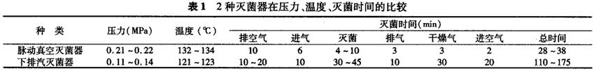 表1 兩種滅菌器在壓力、溫度、滅菌時(shí)間的對(duì)比[2]