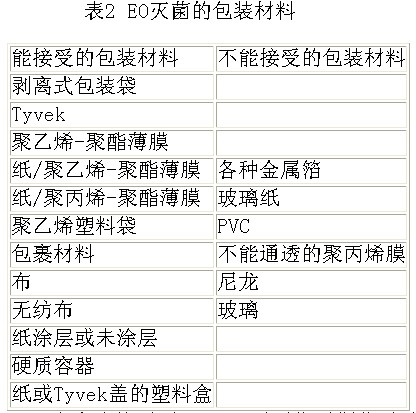 4 EO滅菌包裝材料要求 用于EO滅菌的包裝材料**少需具備以下特點:必須允許EO滅菌劑的進入;能耐受一定的濕度;能較容易地去除EO殘留。常見的EO包裝材料見表2。