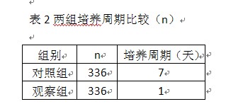 表2兩組培養(yǎng)周期比較(n)