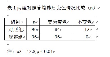2.1兩組對照管經(jīng)培養(yǎng)后變色情況比較見表1